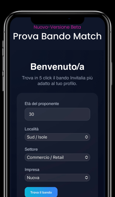Prova BandoMatch.AI: l’algoritmo che semplifica la finanza agevolata e ti mostra solo i bandi davvero adatti al tuo profilo.